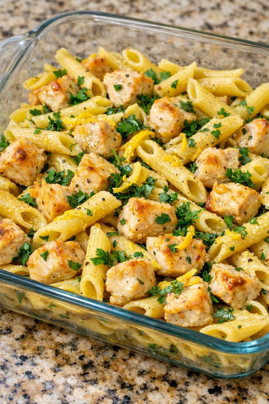 This is the kind of winter weeknight bake I make almost on autopilot: raw chicken cubes and raw dry penne tucked together in a glass roasting pan, then brightened with just three fresh ingredients—lemon, garlic, and parsley. Everything bakes in one dish, the pasta soaking up the chicken juices and lemony broth as it softens. It’s loosely inspired by classic Mediterranean lemon chicken and the American love of baked casseroles, but streamlined to five ingredients and minimal prep. If you can slice a lemon and mince a bit of garlic, you can get this into the oven in under 10 minutes.