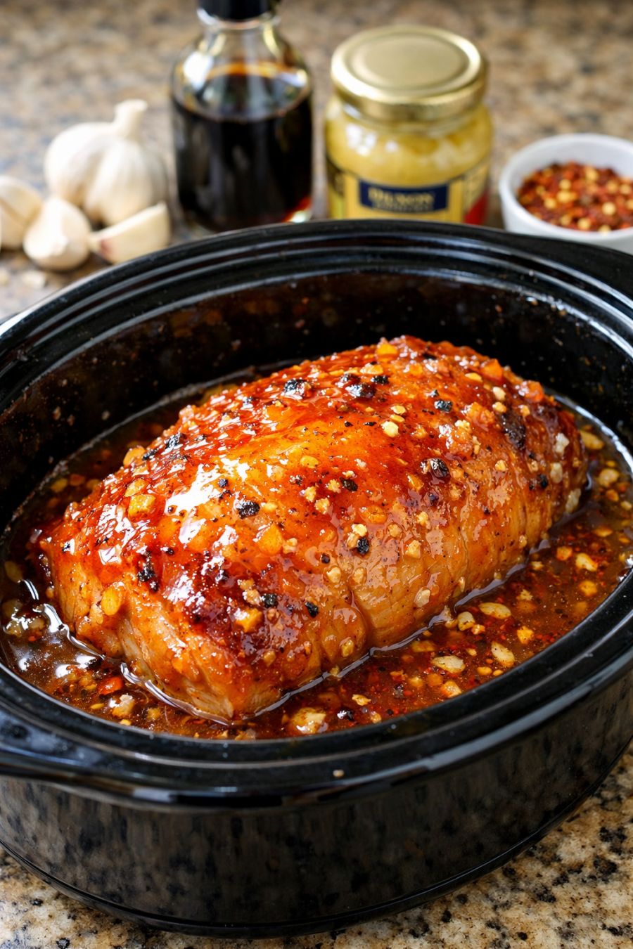 For a little heat, add 1/4 to 1/2 teaspoon red pepper flakes or a squirt of sriracha into the marmalade mixture before spreading it over the pork. If you prefer a more citrus-forward flavor and less sweetness, swap half of the marmalade for orange juice and reduce the soy sauce slightly to keep it balanced. You can also use pork loin instead of tenderloin; just plan on a longer cook time (it’s leaner and thicker, so check for doneness and tenderness after 5 to 6 hours on LOW). To make this more weeknight meal-prep friendly, whisk the marmalade, soy sauce, Dijon, vinegar, garlic, and pepper together the night before and store it in the fridge; in the morning, all you have to do is drop the pork in the slow cooker and spread the pre-made sauce over the top. Leftovers reheat really well and make great lunches—pile the sliced or shredded pork onto toasted rolls with a little extra sauce and some crunchy coleslaw for an easy sandwich, or serve over rice with steamed veggies for a quick bowl. If you like a thicker, almost glaze-like sauce, transfer the cooking liquid to a small saucepan at the end and simmer it on the stove for a few minutes, or whisk in a slurry of 1 teaspoon cornstarch mixed with 1 tablespoon cold water and cook until glossy before pouring it back over the sliced pork.