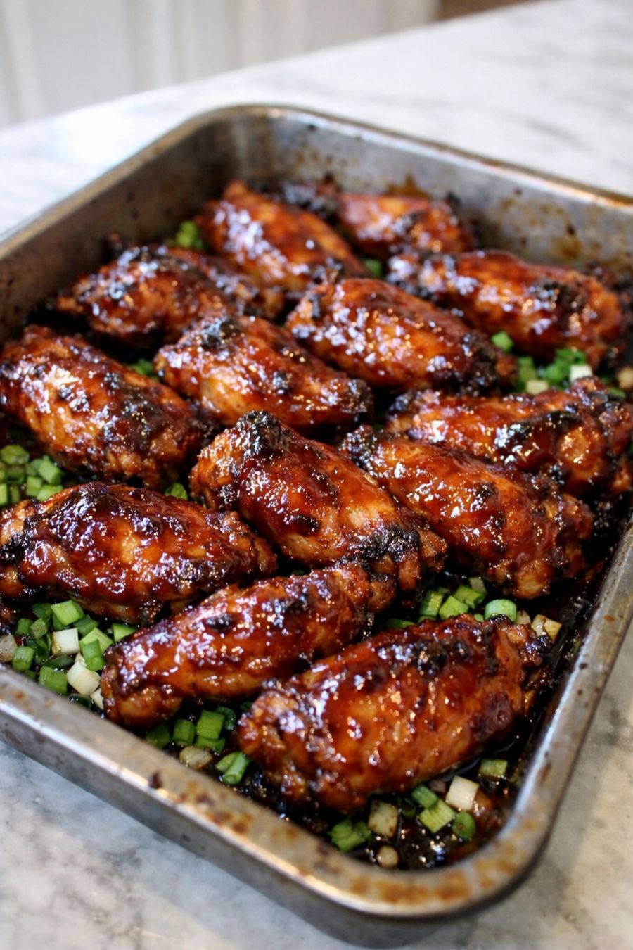Check for doneness: the wings should be deeply glazed, the juices should run clear when pierced at the thickest part, and an instant-read thermometer inserted into the meat (not touching bone) should read at least 165°F (74°C). If you’d like a deeper char, you can leave them in for an extra 5 to 10 minutes, watching closely so the sugars in the sauce don’t burn.