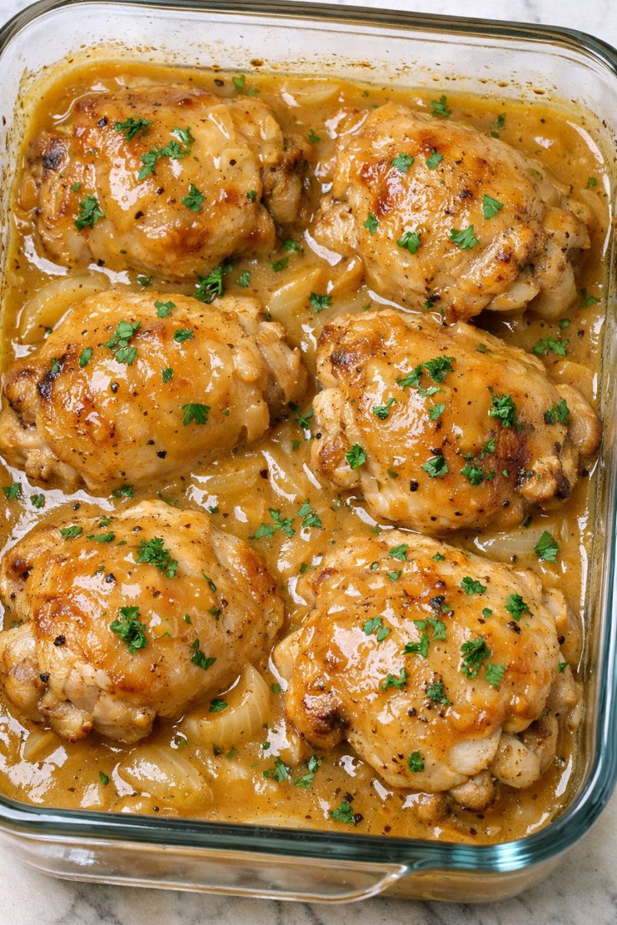 Once done, let the chicken rest in the hot gravy for about 5–10 minutes before serving. This helps the juices settle and the gravy thicken slightly. Serve the chicken thighs straight from the clear glass dish, spooning plenty of that golden gravy over each piece and over whatever you’re serving alongside.