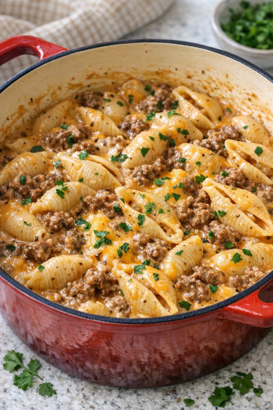Let the creamy beef and shells rest for 3 to 5 minutes with the lid slightly ajar; this helps the sauce cling to the pasta and makes the dish feel extra hearty. Sprinkle with grated Parmesan and chopped fresh parsley, if using, and serve hot straight from the Dutch oven.