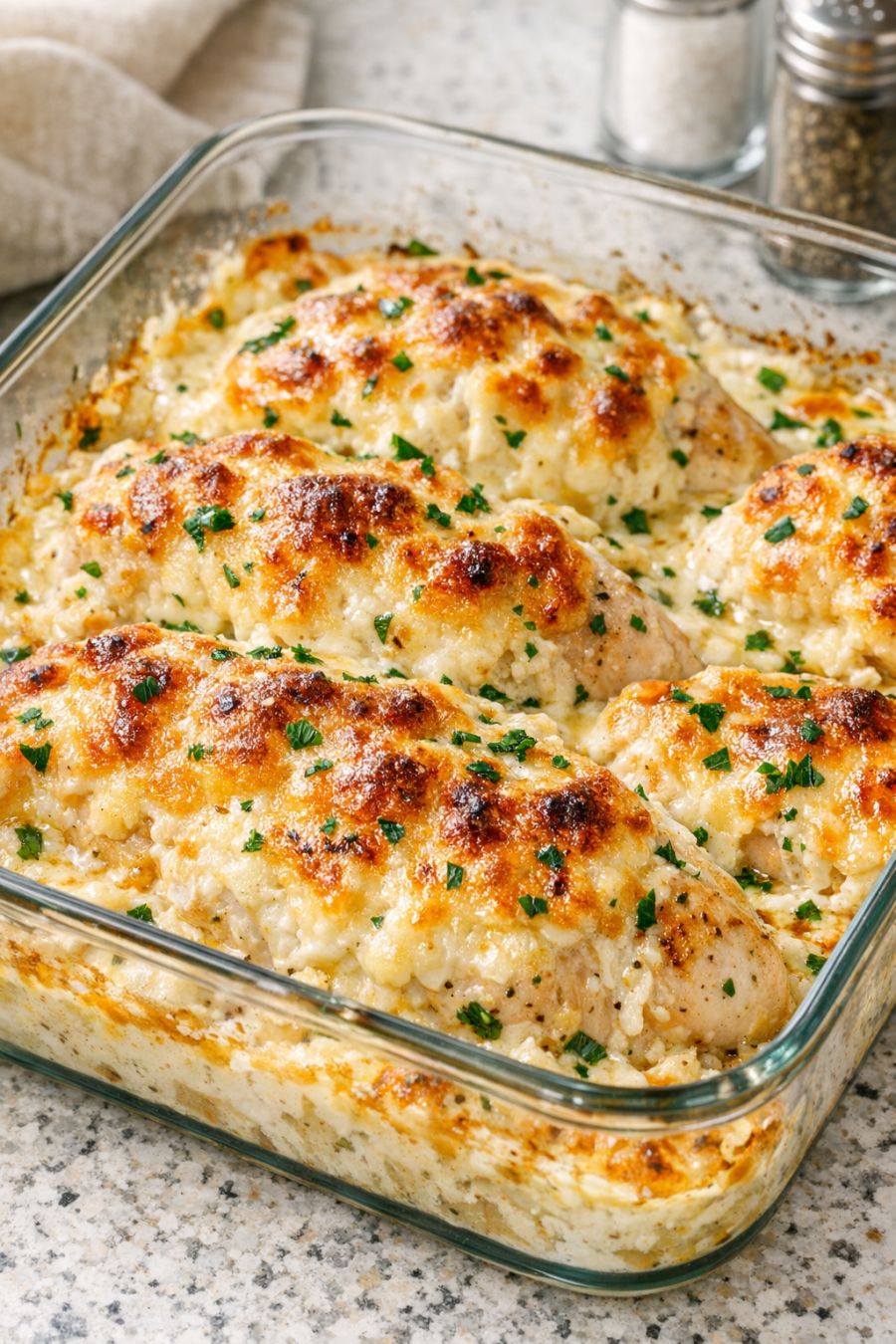Remove the casserole dish from the oven and let the chicken rest for 5 to 10 minutes. This allows the juices to redistribute and the creamy topping to thicken slightly. Sprinkle with chopped fresh parsley, if desired, and serve the chicken with spoonfuls of the extra sauce from the bottom of the glass dish over each portion.