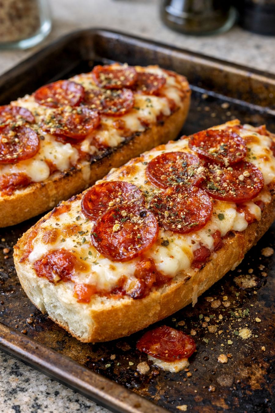Bake in the preheated oven for 12 to 15 minutes, or until the cheese in the mixture is fully melted, the pepperoni pieces look slightly crisped, and the edges of the bread are golden and crunchy.