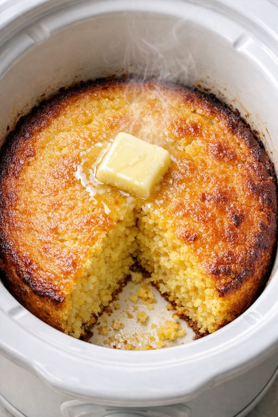 Serve warm: Cut the cornbread into wedges or squares right in the slow cooker. Top each piece with a pat of butter so it melts over the warm, textured surface, and serve alongside chili or your favorite cozy main dish.
