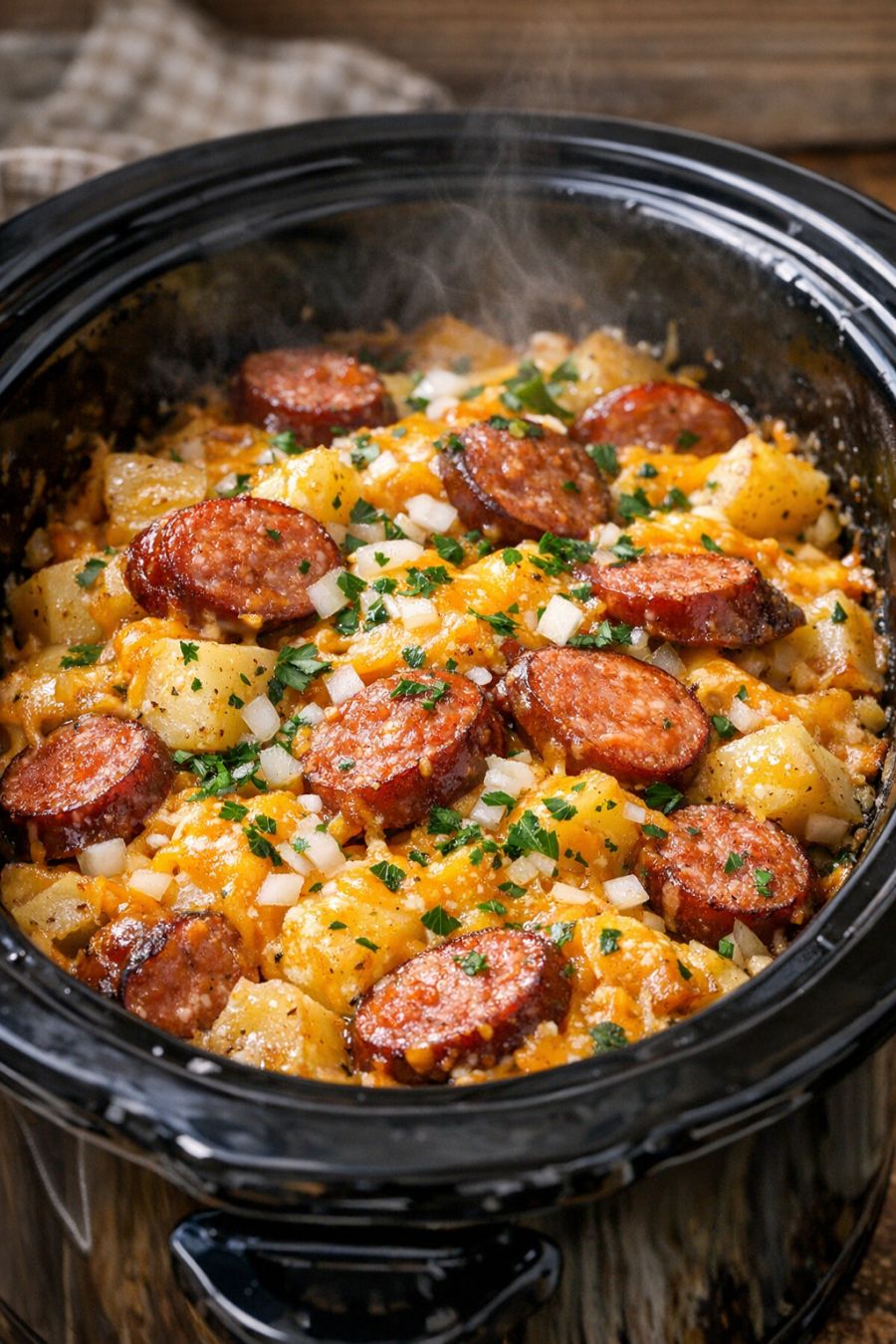 Once done, turn the slow cooker to WARM and let the casserole sit for about 10 minutes to settle before serving. Spoon into bowls, making sure each serving has some of the creamy potatoes, smoky sausage, and melted cheese.