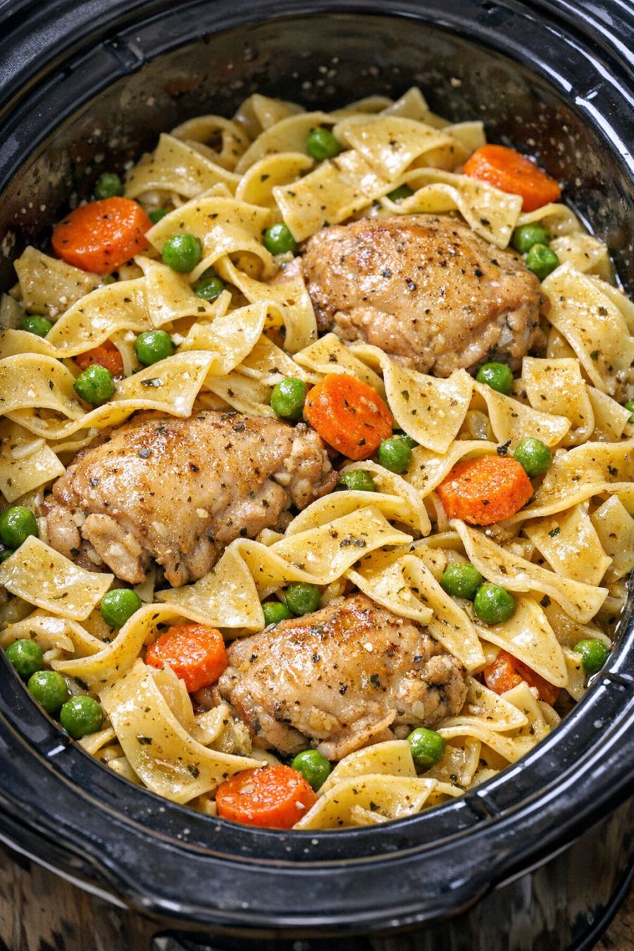For extra richness, stir in 2 to 4 tablespoons of softened cream cheese or a splash of heavy cream after the noodles are cooked and let it melt into the sauce. If you like more of a classic Amish chicken-and-noodles feel, use plain Italian dressing (not creamy) and add a pinch of dried parsley or thyme with the broth and soup. To sneak in veggies, stir in 1 to 2 cups of frozen peas and carrots or mixed vegetables when you add the noodles; they’ll cook through in the same 20 to 30 minutes. You can swap boneless, skinless chicken breasts for thighs, but check them a bit earlier so they don’t dry out before shredding. For a thicker, stew-like texture, let the finished dish sit on WARM for 10 to 15 minutes with the lid off so the sauce can reduce slightly. Leftovers reheat well on the stovetop with a splash of broth or water to loosen the noodles back up, making this a great make-ahead lunch for the next day.