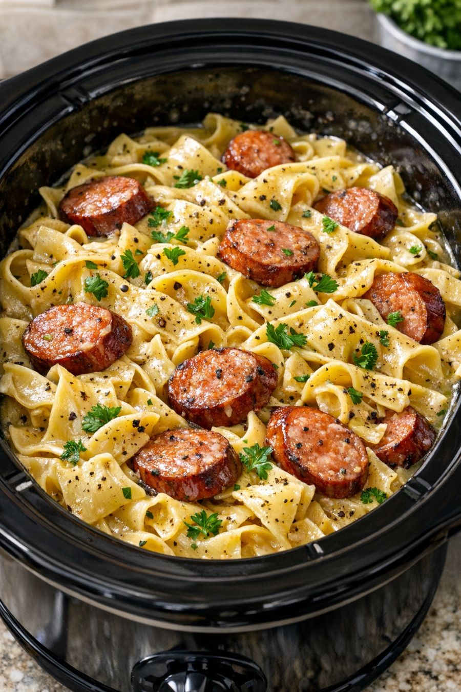 Slow Cooker Amish Kielbasa Noodle Feast