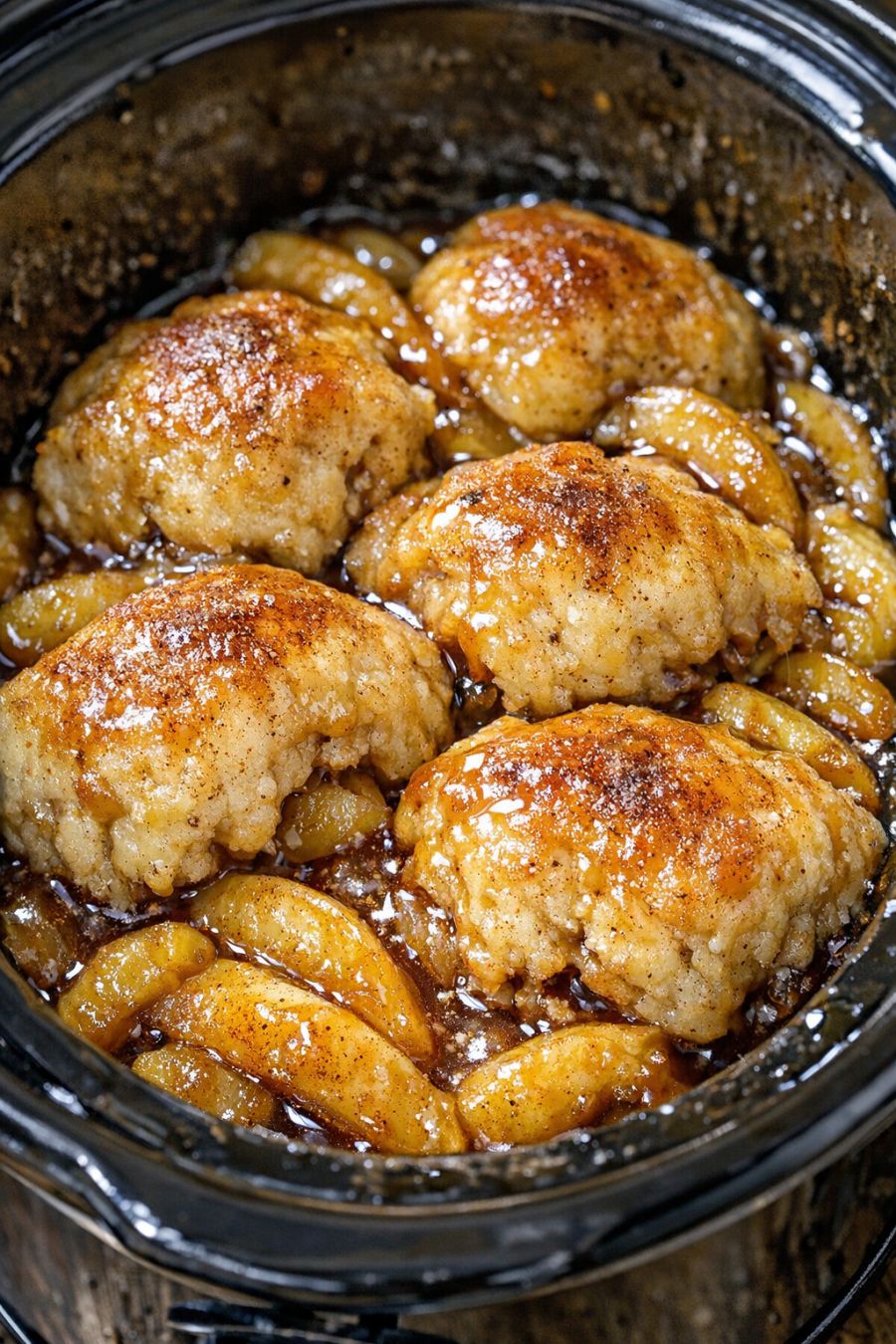 Cook on HIGH for 2 to 3 hours, or on LOW for 4 to 5 hours, until the apples are soft and the biscuit pieces on top are puffed and cooked through in the center. Avoid lifting the lid during the first 1 1/2 hours so the dumplings can rise properly.