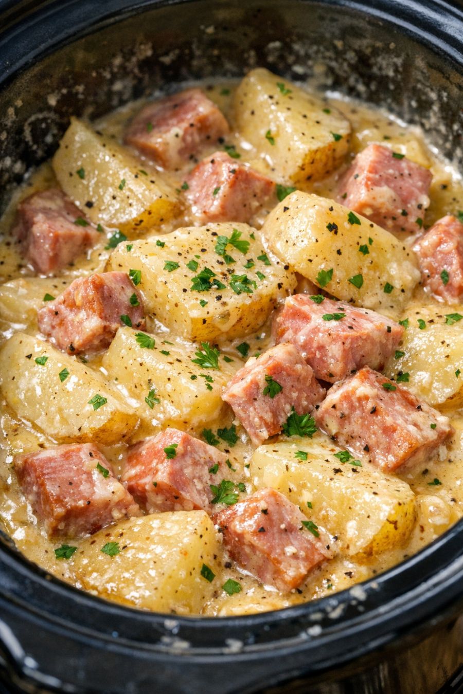 Once cooked, gently stir just enough to coat some of the ham and potatoes with the sauce while still keeping some of the layers intact. Taste and add a pinch more pepper or a little salt if needed, depending on how salty your ham is.