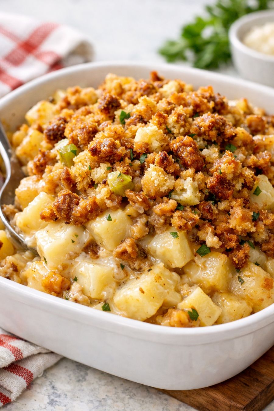 Serve these stuffing potatoes alongside roast chicken, turkey, pork chops, or meatloaf for a complete comfort meal. A simple green vegetable—like steamed green beans, peas, or a tossed salad—helps balance the richness. They’re also wonderful with gravy on top or next to cranberry sauce during the holidays. If you’re feeding a crowd, pair this dish with warm dinner rolls and a pan of roasted carrots so everyone can build a hearty, homey plate.