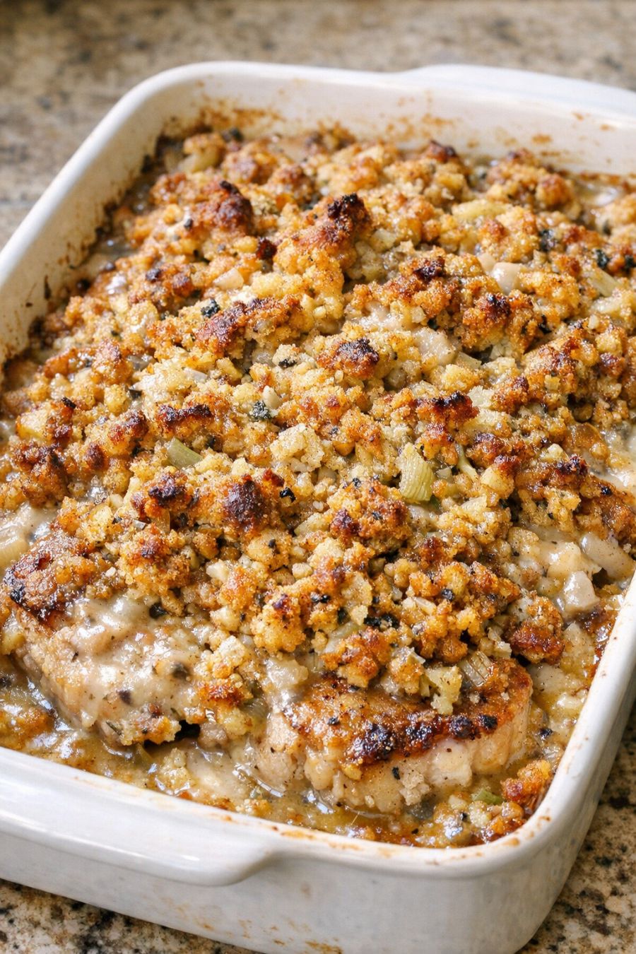 Use cream of chicken or cream of celery soup instead of cream of mushroom if that’s what you have on hand or prefer. Bone-in pork chops also work; just add an extra 5–10 minutes of baking time and check the internal temperature. For more flavor, sprinkle a little dried thyme, poultry seasoning, or garlic powder over the pork chops before adding the stuffing mix. If you like a crispier top, broil the pan for 1–2 minutes at the end of baking, watching closely so the stuffing doesn’t burn. To add veggies without extra effort, scatter a cup of frozen mixed vegetables or frozen green beans over the pork chops before adding the stuffing mix, then pour the soup mixture over everything as directed. You can prep the dish in the morning, cover it, and refrigerate it; when you’re ready to bake, add 5–10 minutes to the covered baking time to account for the cold dish. If you need to feed more people, use a larger pan and add 1–2 extra pork chops and a second box of stuffing, increasing the soup and broth proportionally.