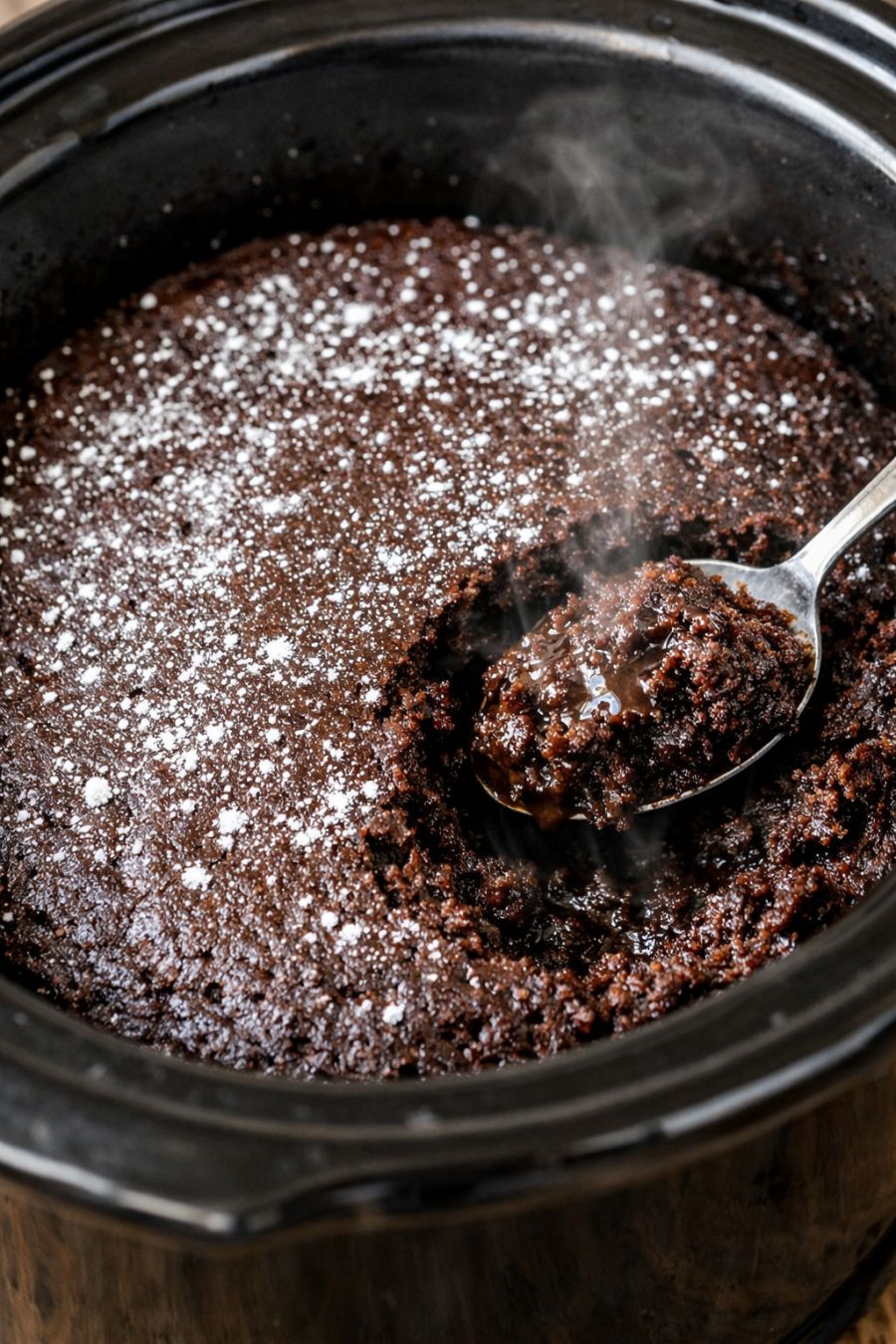 Right before serving, lightly dust the top of the cake with powdered sugar for a pretty contrast against the dark, stout-infused surface. Use a large spoon to scoop the warm cake directly from the slow cooker into bowls, making sure to dig down so everyone gets some of the dense, fudgy center.