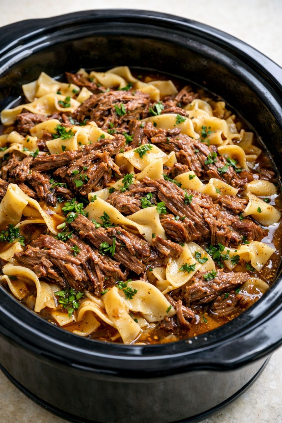Serve the tender pot roast and broth-laced noodles in wide bowls, making sure each portion gets plenty of shredded beef and savory cooking liquid. A side of buttered peas or green beans adds color and freshness, while a simple green salad with a tangy vinaigrette balances the richness. Warm dinner rolls or crusty bread are perfect for soaking up the broth. If you’d like a little extra comfort, finish each bowl with a sprinkle of chopped fresh parsley or a small pat of butter over the noodles just before serving.