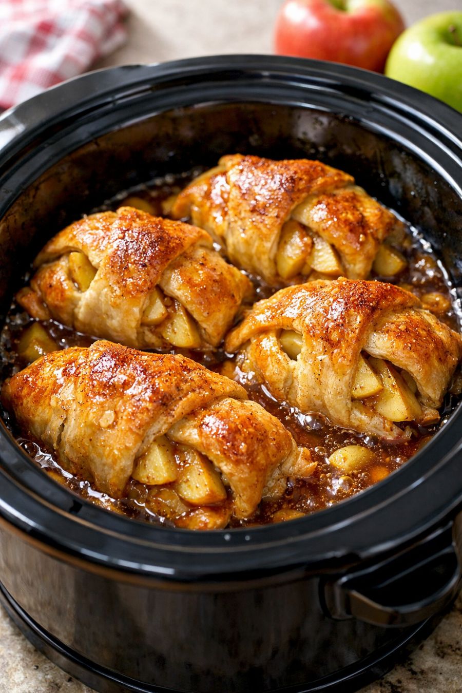 Arrange the dough-wrapped apples in a single snug layer in the bottom of the slow cooker. It’s fine if they touch each other.
