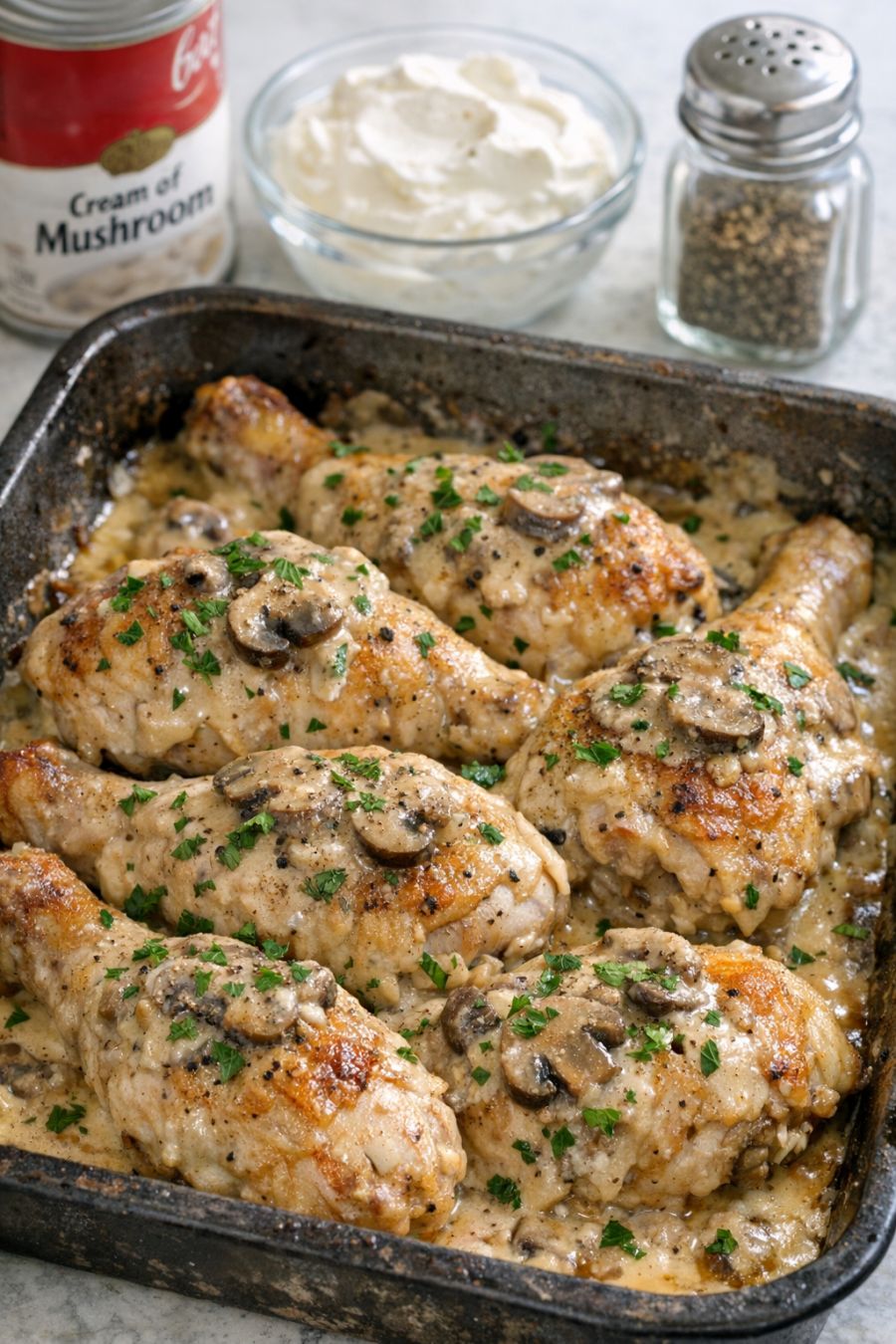 Remove the pan from the oven and let the chicken rest for about 5–10 minutes. The sauce will thicken slightly as it stands. Spoon some of the creamy mushroom gravy from the bottom of the pan over each chicken leg before serving, and serve any extra gravy at the table.