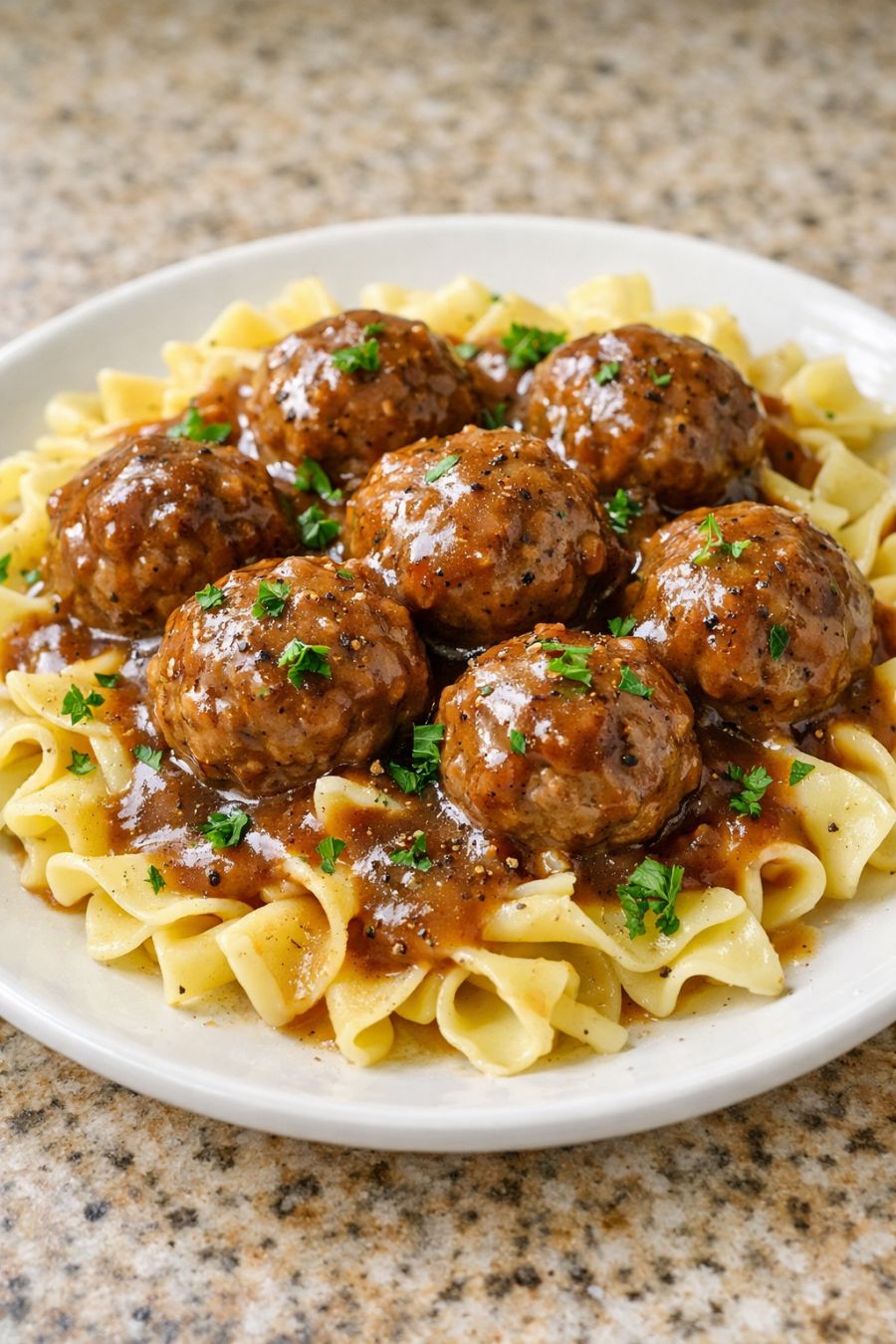 To serve, spoon a generous portion of buttered egg noodles into each bowl or onto each plate, then ladle the Amish-style meatballs and rich brown gravy over the top. Serve hot.