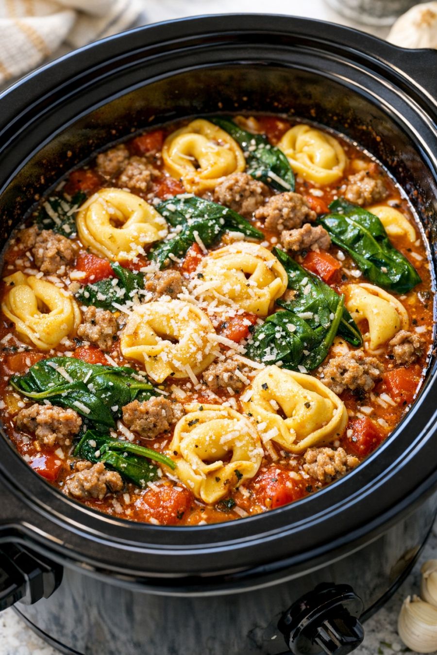 This is my default slow cooker tortellini soup for the nights when I stare into the fridge and have zero plan. It’s the definition of low-effort comfort: you literally pour chicken broth over raw Italian sausage in the slow cooker, toss in just four more pantry-friendly ingredients, and walk away. A few hours later, you’ve got a cozy, Midwest-style, stick-to-your-ribs soup that feels like you put in way more effort than you did. It’s not fancy or traditional to any one region—it’s just practical, family-friendly, and perfect for busy workdays when you still want something homemade.