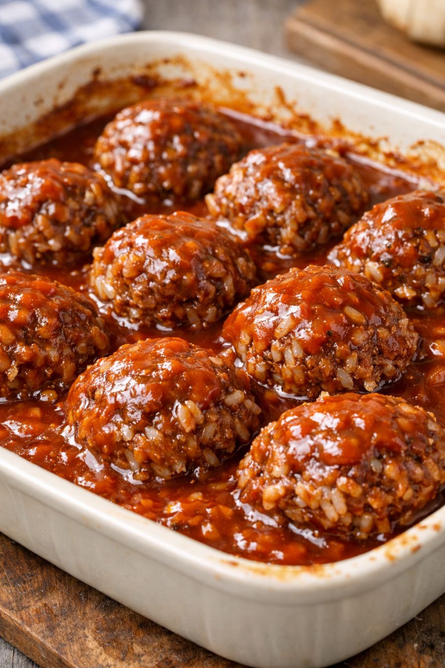 Shape the beef and rice mixture into golf ball–sized meatballs, about 1 1/2 inches in diameter. You should get roughly 18–24 meatballs, depending on size. Arrange them in a single layer in the prepared baking dish, leaving a little space between each one.