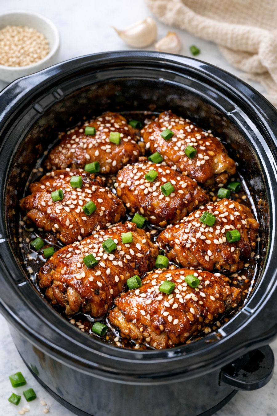 Once cooked, give everything a good stir so the sesame seeds and sauce are evenly distributed and the chicken is coated in the sticky, savory glaze. If you’d like the sauce slightly thicker, remove the lid and cook on HIGH for an additional 15 to 20 minutes, stirring once or twice.