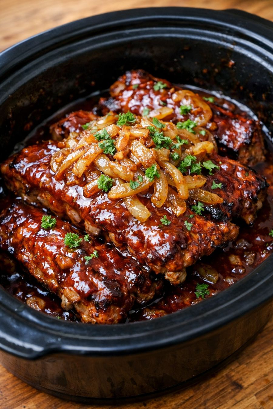 Once done, carefully remove the ribs with tongs—they will be very tender. Spoon some of the saucy juices and onions from the slow cooker over the ribs before serving.