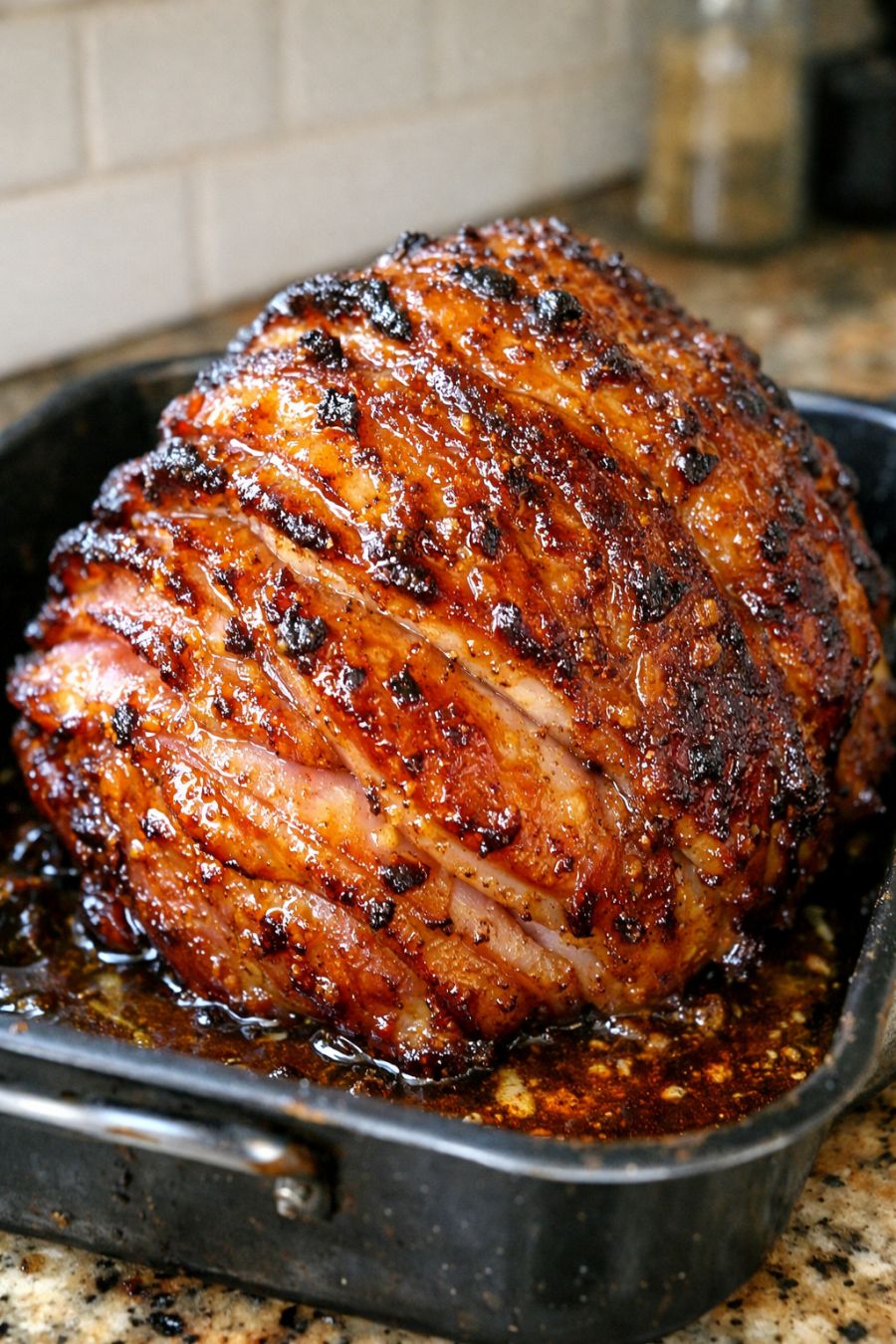 Once the ham is nicely browned and glossy, remove the pan from the oven and let the ham rest, loosely tented with foil, for 10–15 minutes. This helps the juices settle back into the meat.
