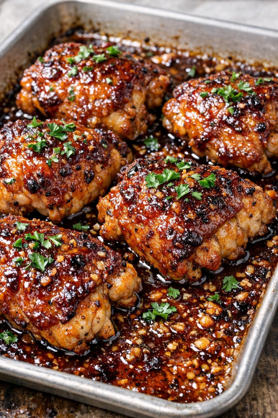 This is the kind of supper that has kept farm families going for generations: a pan of saucy chicken thighs that you can slide into the oven and forget about while you set the table. The trick here is a single sweet glaze—just bottled barbecue sauce, honey, minced garlic, smoked paprika, and onion powder—brushed straight onto raw chicken thighs right on the baking sheet. It tastes like you fussed all afternoon, but it comes together in minutes, the way busy Midwestern home cooks have always liked to do things: simple, hearty, and full of flavor.