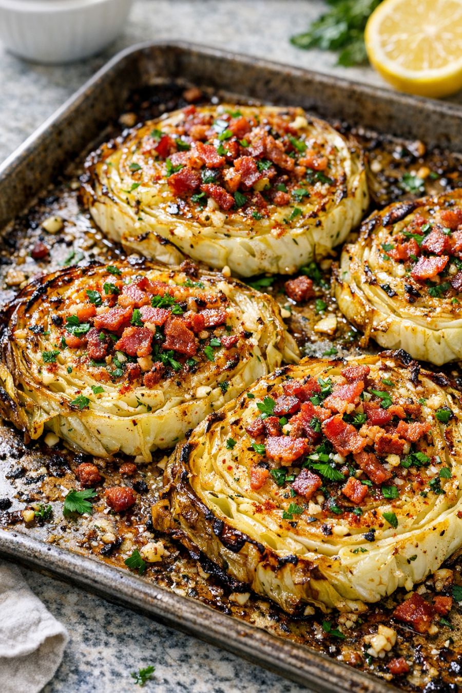 This is my kind of weeknight side dish: thick cabbage “steaks” laid out on a baking sheet, then absolutely drenched in one savory mixture of melted butter, minced garlic, onion powder, smoky paprika, and crispy bacon bits. As it roasts, the cabbage softens around the edges, the centers stay a little tender, and all that buttery bacon goodness sinks into the layers. It feels a little Southern in spirit—simple ingredients, big flavor, and a little bacon love—without needing a lot of hands-on time. It’s the kind of dish that looks humble going into the oven but comes out way more satisfying than you’d expect.