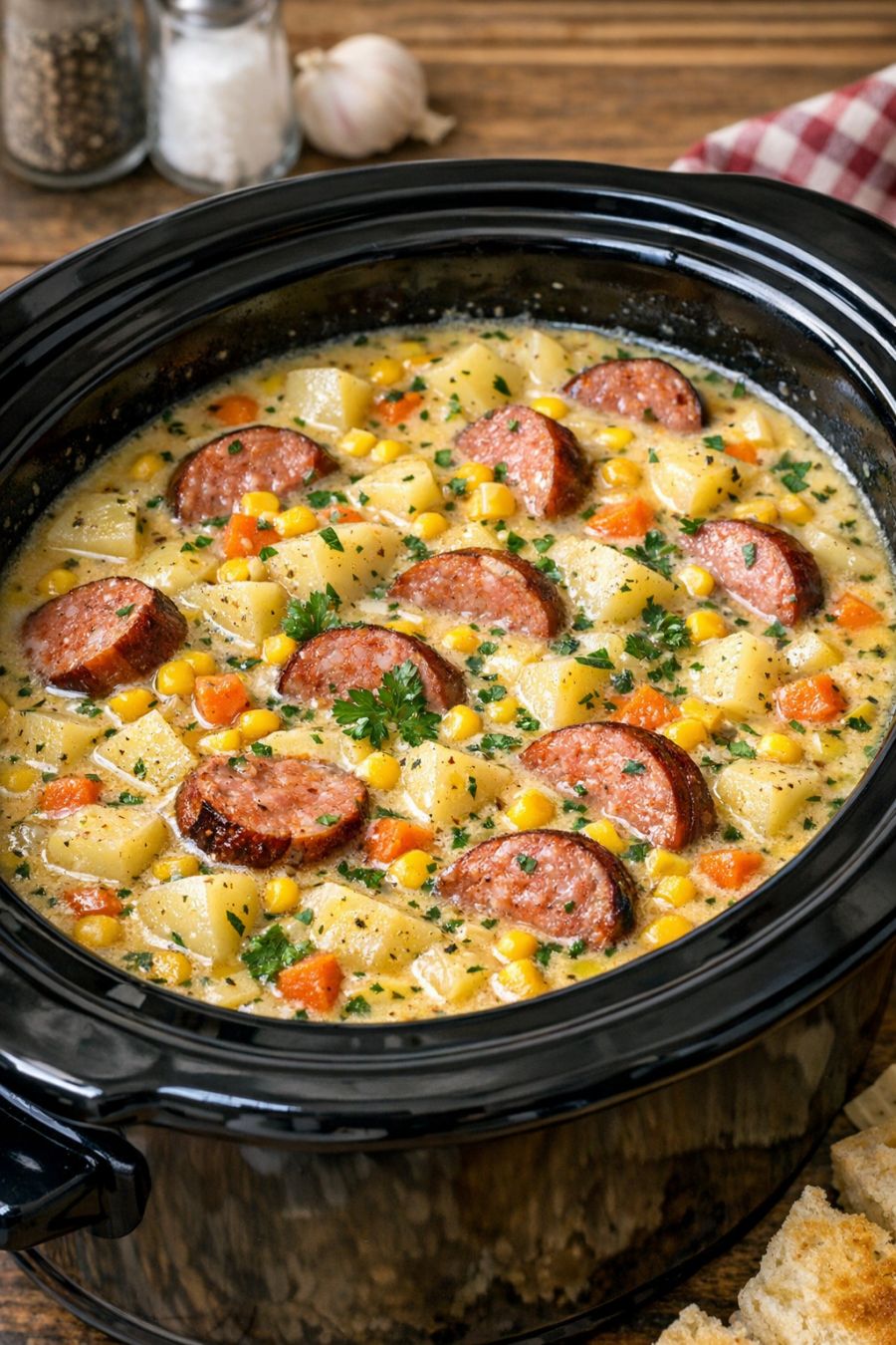 Cover the slow cooker with the lid. Cook on LOW for 6–7 hours or on HIGH for 3–4 hours, until the potatoes are very tender and the sausage is heated through and flavorful.