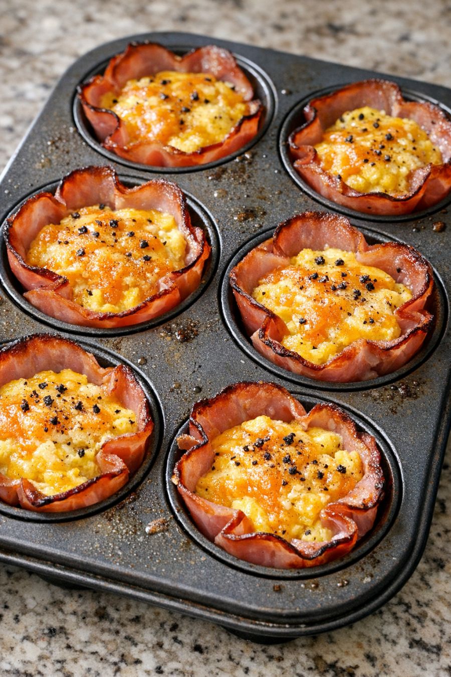 Preheat your oven to 375°F (190°C). Lightly grease a 12-cup muffin tray with nonstick cooking spray or a little butter, making sure to coat the sides so the ham and eggs release easily.