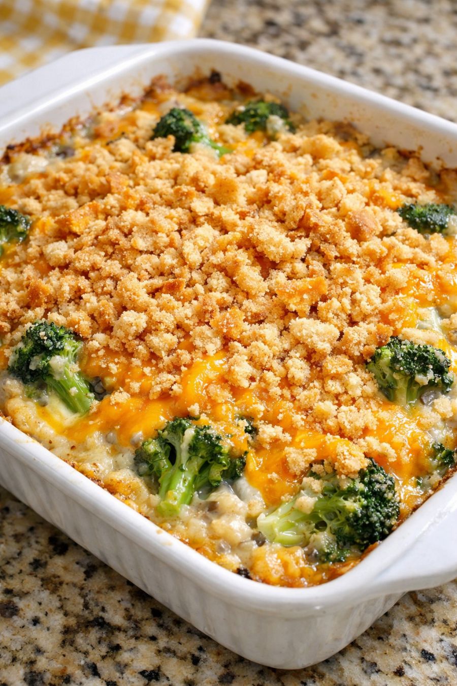 For picky eaters, chop the broccoli smaller so it blends more into the creamy layer, or mix a little of the broccoli directly into the thick soup-cheese mixture before spreading it over the rest. If your family doesn’t love sharp cheddar, use mild cheddar or a Colby-Jack blend for a gentler flavor. To add protein, stir 1–1 1/2 cups of cooked, diced chicken or ham into the thick mixture before spreading it over the broccoli. For a slightly lighter version, swap half the mayonnaise for plain Greek yogurt and use reduced-fat cheddar, keeping in mind the casserole may be a bit less rich but still satisfying. If you don’t have buttery crackers, use crushed cornflakes or panko bread crumbs tossed with the melted butter for the topping. To make it more kid-friendly, skip the garlic and onion powder and just season lightly with salt and pepper, then offer hot sauce at the table for the adults. This casserole can be assembled a day ahead: steam the broccoli, spread it in the dish, mix and spread the thick topping over the florets, cover tightly, and refrigerate. Add the crumb topping just before baking, and increase the bake time by about 5–10 minutes if going straight from the fridge.
