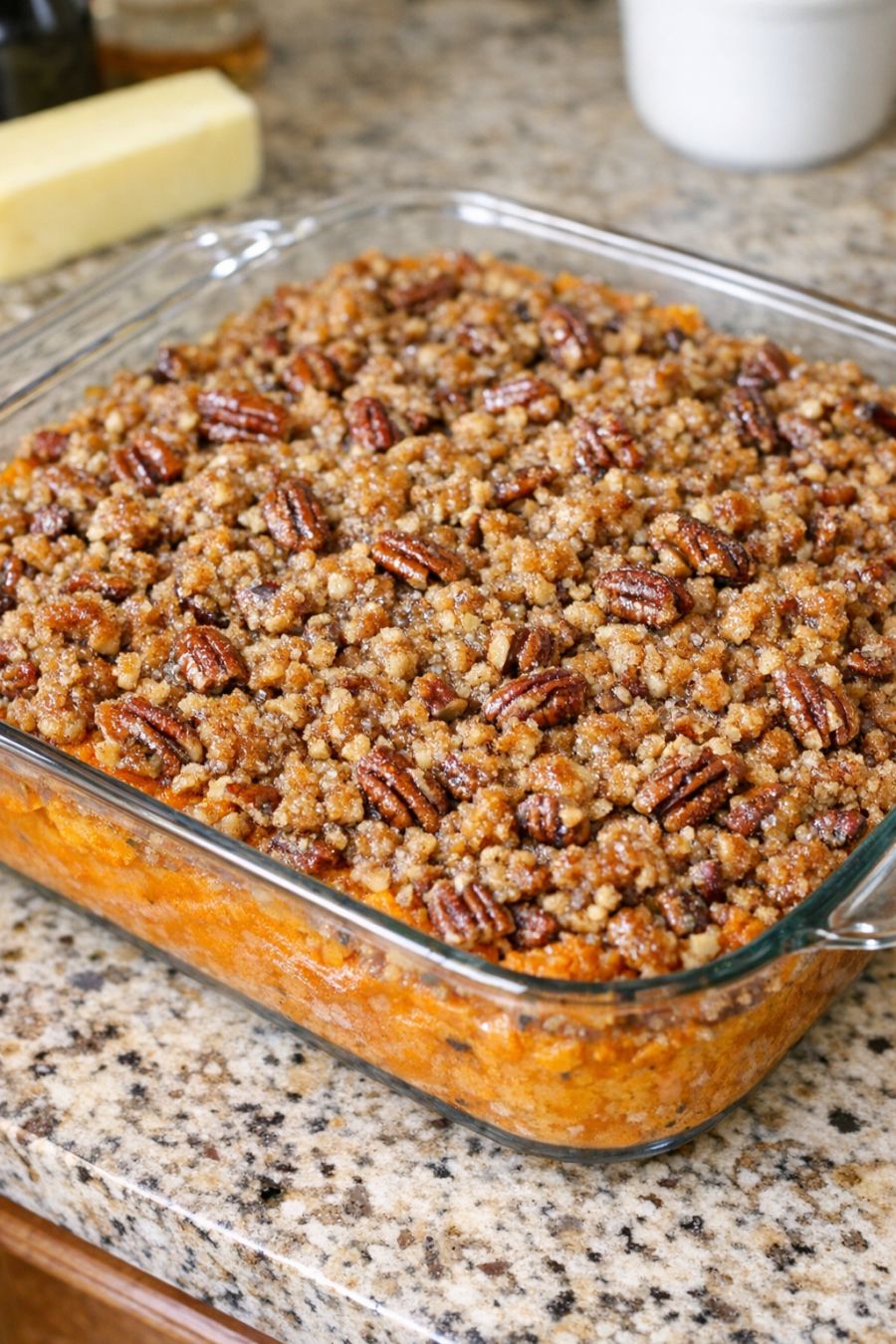 Southern Sweet Potato Casserole with Crunchy Pecan Topping