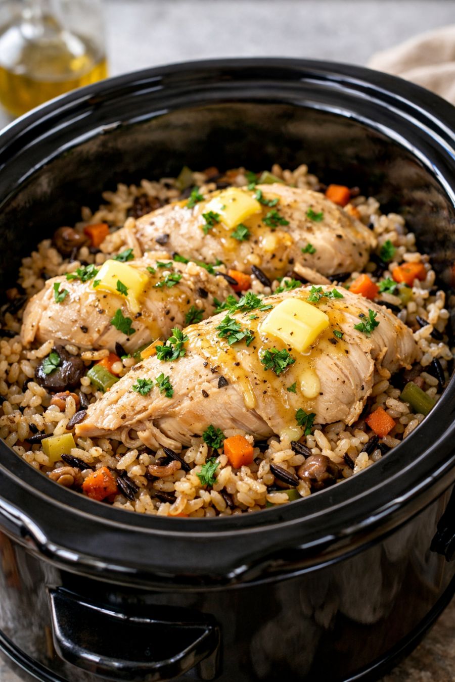 Once done, use two forks to gently shred or slice the chicken right in the slow cooker, stirring it into the rice and juices. Taste and adjust seasoning if needed, adding a pinch of salt or pepper to your liking.