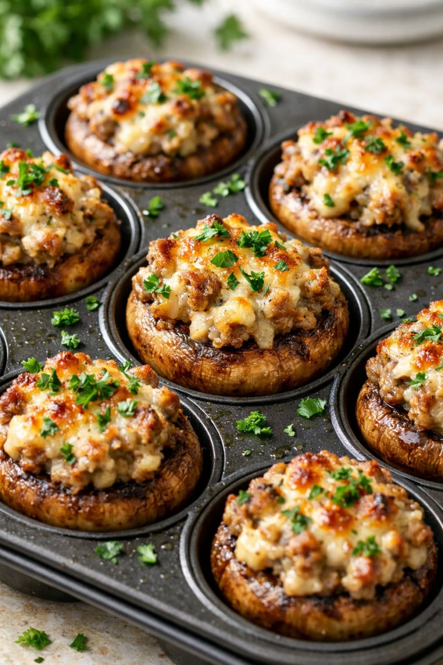 Slide the muffin tray into the preheated oven and bake for 18–22 minutes, or until the mushrooms are tender, the filling is hot, and the tops look slightly golden and bubbly.