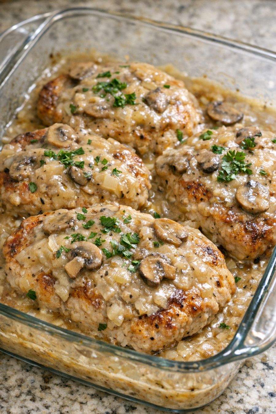 Let the pork chops rest in the baking dish for about 5 minutes so the juices settle and the sauce thickens slightly. Serve the smothered pork chops hot, spooning plenty of the mushroom-onion gravy over each portion.