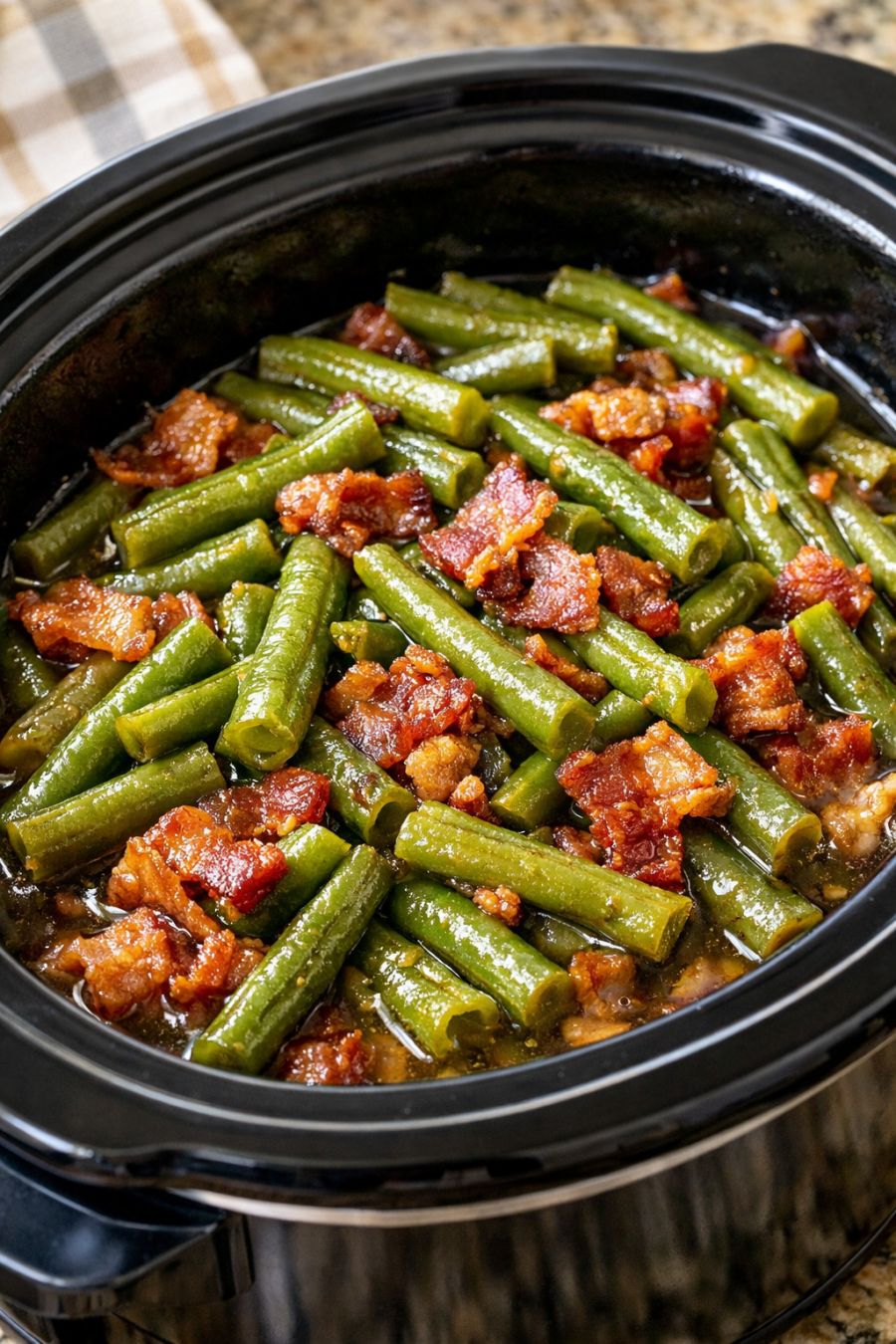 These green beans cozy up nicely to just about any main dish: Sunday pot roast, meatloaf, baked chicken, or a skillet of pork chops. They’re wonderful spooned alongside mashed potatoes or buttered egg noodles so the savory juices don’t go to waste. For a lighter plate, serve them next to grilled fish or a simple roast turkey breast. Set the slow cooker on the counter and let folks help themselves; they’ll go back for seconds without a bit of coaxing.