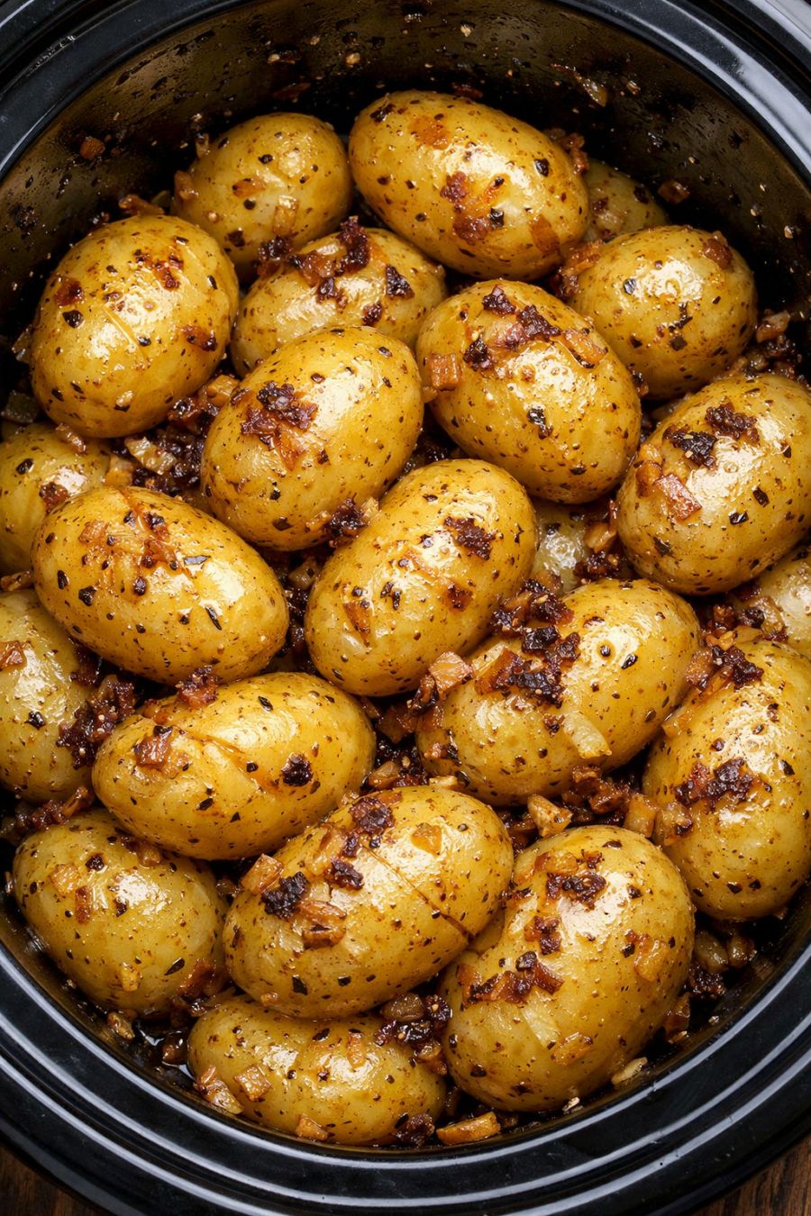 Switch the slow cooker to the WARM setting for serving. Serve the potatoes directly from the crock, spooning some of the buttery onion sauce over the top so they glisten and show off the dark, savory onion bits.