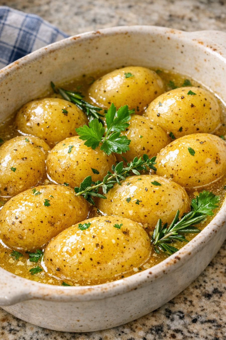 Remove from the oven and let the potatoes rest for 5 minutes so the remaining broth thickens slightly around them. Taste and add a light sprinkle of salt and black pepper at the table if you like, then serve warm straight from the ceramic dish.