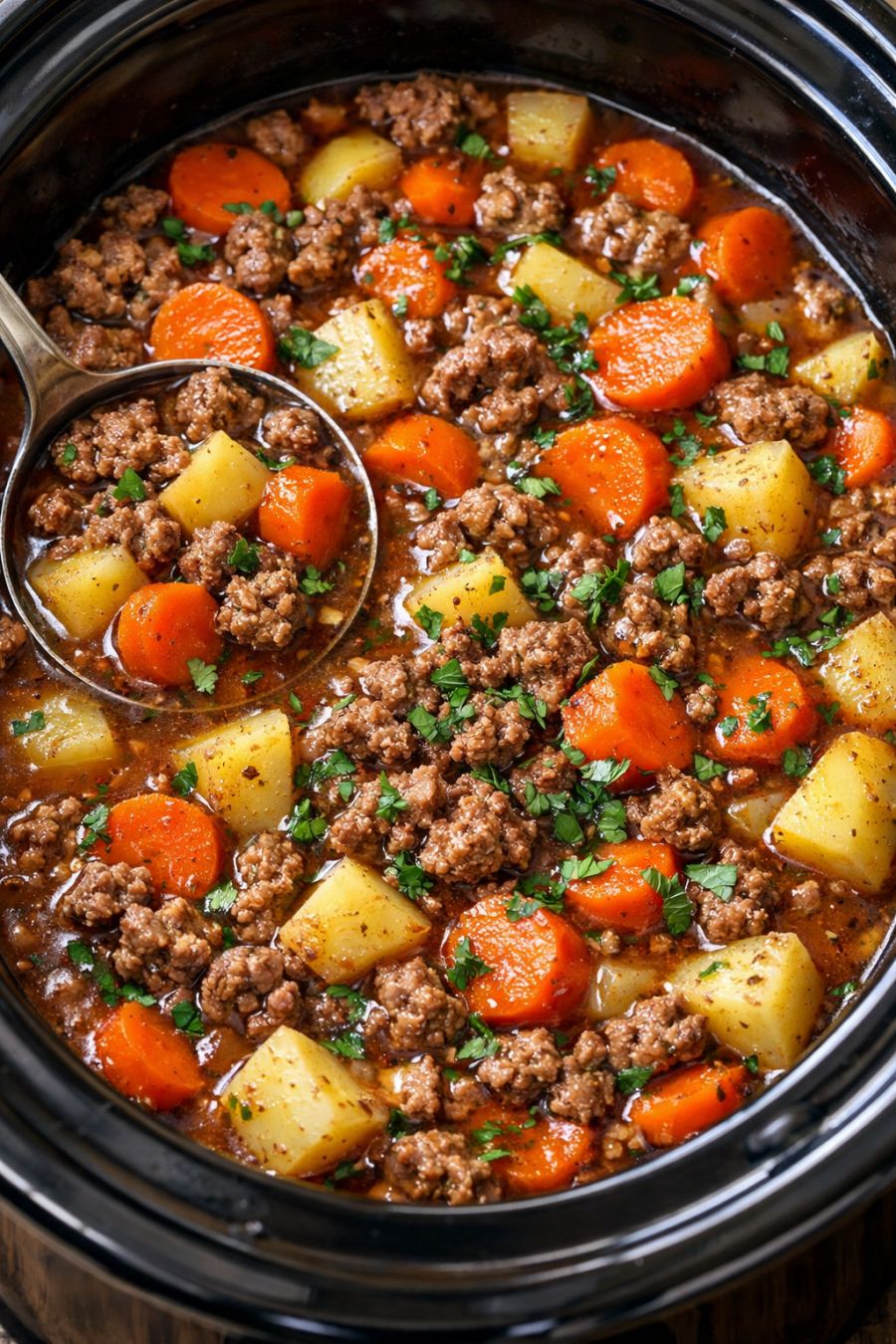 Cover the slow cooker with the lid and cook on LOW for 7 to 8 hours, or on HIGH for 3 1/2 to 4 hours, until the carrots and potatoes are very tender and the ground beef is fully cooked through.