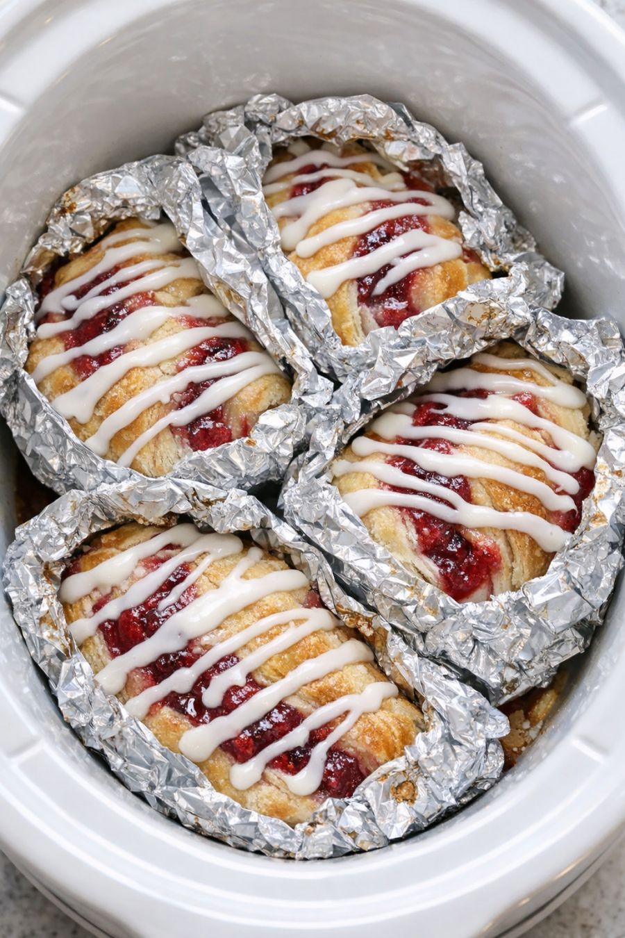 Swap the raspberry: You can use almost any thick fruit pie filling or preserves you like—cherry, blueberry, strawberry, or even apple. Just keep it thick so it doesn’t run out of the dough. Add a hint of flavor: Stir a splash of vanilla or almond extract into the cream cheese mixture for a bakery-style touch. Make them less sweet: Reduce the powdered sugar in the cream cheese mixture or skip the icing and just dust the finished packets with a little powdered sugar. Extra-indulgent version: Sprinkle a few chocolate chips over the cream cheese before adding the raspberry for a chocolate-raspberry combo. Crunchy top: After cooking, you can unwrap the packets, transfer the pastries to a baking sheet, and broil for 1–2 minutes to lightly brown the tops before drizzling with icing (only if you want a bit of texture; they’ll be softer if you skip this). Prep ahead: You can assemble the foil-wrapped packets the night before and refrigerate them on a tray; in the morning, place them into the slow cooker (still wrapped) and add 15–20 minutes to the cook time. Different sizes: For a brunch spread with lots of options, cut each crescent triangle in half and make mini packets—just reduce the cook time slightly and start checking earlier.