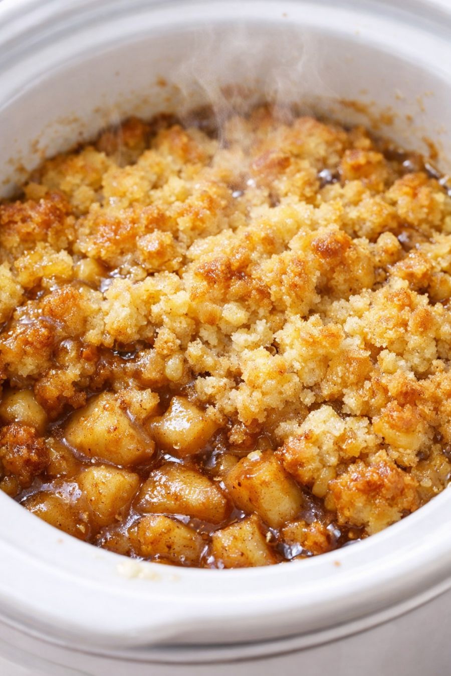 Cover the slow cooker with the lid and cook on HIGH for 2 to 3 hours, or on LOW for 4 to 5 hours, until the apple filling is bubbling around the edges and the cake mix on top looks set and golden with buttery crumbs.