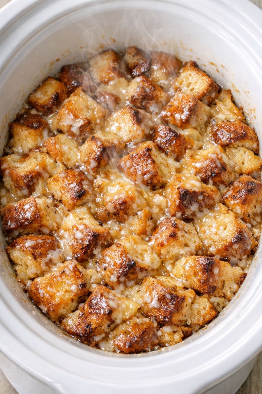 Cover the slow cooker with the lid. Cook on LOW for 2 1/2 to 3 1/2 hours, or until the bread pudding is puffed, the edges are golden brown and lightly crisp, and the center is set but still soft and custardy. You should see steam when you lift the lid and the cubes will be melded together.