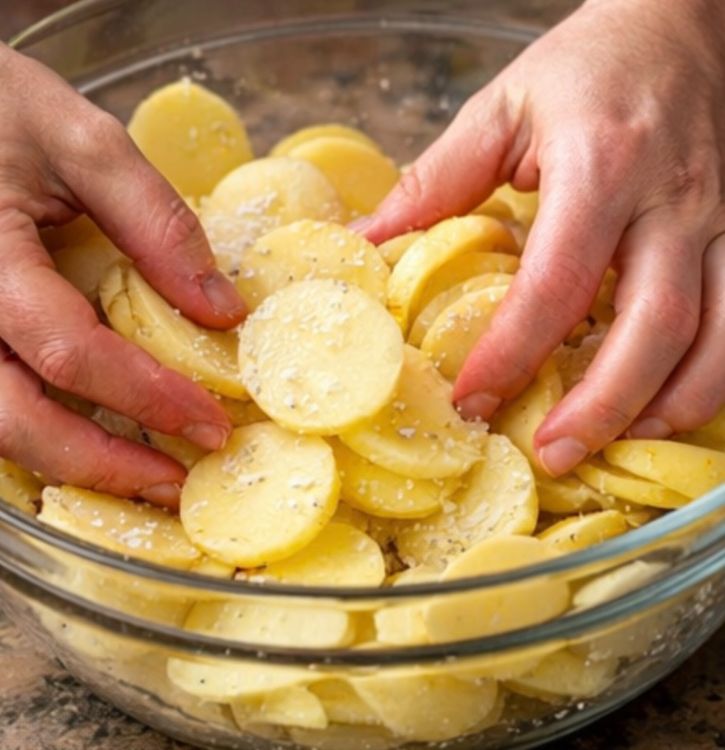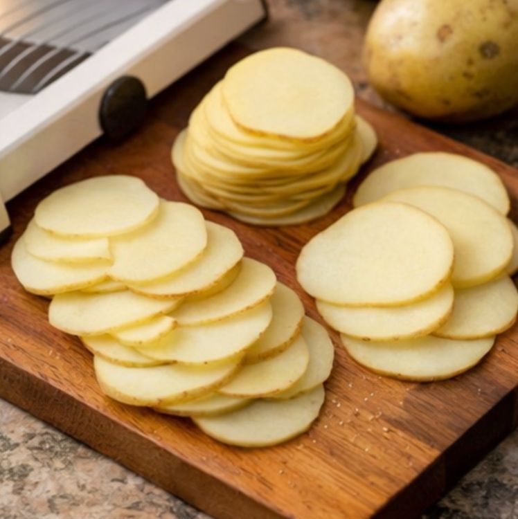 Slice the potatoes into very thin rounds, about 1/8 inch thick or a little less. A mandoline makes quick work of this, but a sharp knife and a steady hand do just fine. Try to keep the slices roughly the same thickness so they cook evenly.