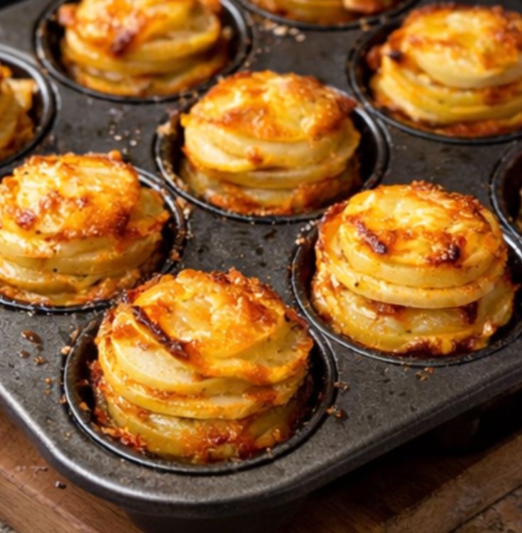 If you’d like a little more richness, you can brush the muffin cups with extra melted butter before adding the cheese, but keep in mind that still counts within the original four ingredients. For a slightly different flavor, swap half of the cheddar for another cheese that melts well, such as Colby or Monterey Jack—just don’t add more than one extra cheese if you’re trying to honor the simple spirit of the recipe. You can also change the character of the dish by using Yukon Gold potatoes for a creamier interior and russets for a fluffier, more layered bite. To make ahead for a holiday meal, bake the stacks until just tender, cool, cover, and refrigerate; then reheat uncovered at 375°F until hot and crisp around the edges. If you have leftovers, they reheat nicely in a skillet over medium heat, cut side down, until warmed through and re-crisped. For smaller gatherings, halve the recipe and bake in the middle cups of the pan so they brown more evenly.