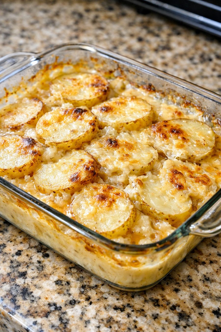 For extra richness, swap half of the milk for heavy cream, or stir in 2 tablespoons of melted butter before pouring the sauce over the potatoes. If you’d like gentle onion flavor without adding another main ingredient, rub a cut clove of garlic or a halved onion around the inside of the glass casserole dish before layering the potatoes. To stretch this into more of a main dish while still keeping the spirit of the recipe, you can fold in 1–2 cups of cooked, shredded chicken or leftover rotisserie chicken between the potato layers. For a slightly lighter version, use low-sodium condensed cream of chicken soup and 2% milk, and serve with plenty of vegetables on the side. You can also play with texture: uncover the casserole a bit earlier and sprinkle a modest handful of breadcrumbs over the top for a crisper finish, or leave it covered the entire time for a softer, stew-like consistency. Finally, if you need to make this ahead, assemble the dish up to the point of baking, cover tightly, refrigerate for up to 24 hours, then add 5–10 minutes to the baking time to account for the chill.