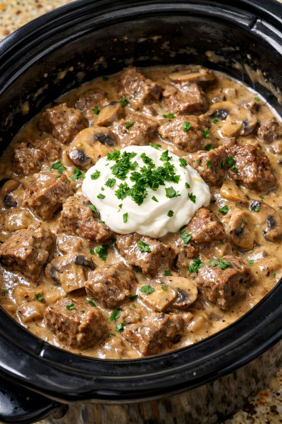 If you have picky eaters, you can use just one can of cream of mushroom soup and one can of cream of chicken soup for a milder flavor. For a bit of extra richness, stir in 2 to 3 tablespoons of cream cheese along with the sour cream at the end until melted and smooth. If you like mushrooms, add 1 to 2 cups of sliced fresh mushrooms on top of the beef before stirring in the soup at the beginning; they’ll cook down and blend into the sauce. To stretch the meal for a larger family, add an extra 1/2 pound of beef stew meat and a splash (about 1/4 cup) of water or beef broth so there’s plenty of sauce. For a slightly lighter version, use light sour cream and serve over steamed cauliflower or zucchini noodles instead of pasta or potatoes. You can also swap the onion soup mix for a homemade blend of dried minced onion, garlic powder, and a pinch of paprika if you’re watching sodium. Leftovers reheat well on the stovetop over low heat; just add a spoonful of water or broth to loosen the sauce and warm gently so the sour cream doesn’t separate.