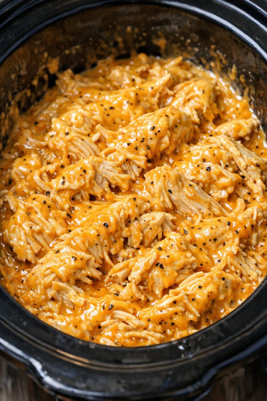 Once the chicken is cooked, use two forks right in the slow cooker to gently shred or pull the chicken into large, tender pieces, mixing it into the melted orange cheese sauce. The sauce should be glossy and creamy with visible flecks of black pepper.