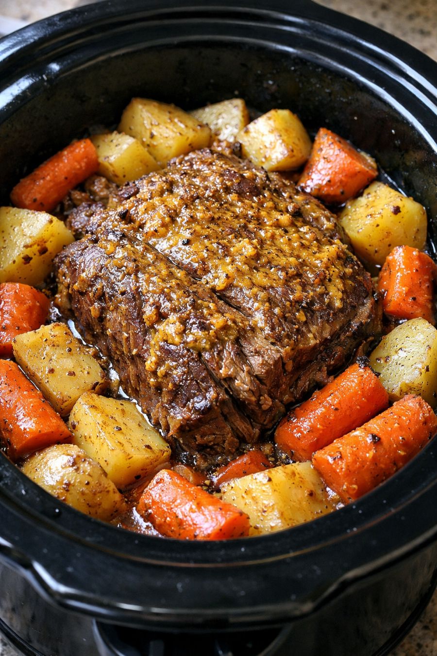 For a slightly sweeter, more old-fashioned flavor, swap half of the yellow mustard with honey mustard or add an extra tablespoon of brown sugar. If you like a bit of heat, stir 1 to 2 teaspoons of prepared horseradish or hot sauce into the mustard before spreading it on the roast. To bulk this into a full one-pot meal, tuck 1 1/2 pounds of baby potatoes and a few large carrots (cut into chunks) around the roast before cooking, keeping the mustard coating on the meat itself. You can also use a different cut of beef, like bottom round or rump roast; just keep in mind those can be a bit leaner and may need the full cook time on LOW to get really tender. For a richer gravy, remove the cooked meat, whisk 1 to 2 tablespoons of cornstarch with a little cold water, stir it into the hot juices, and cook on HIGH for about 10 minutes until thickened. Leftovers freeze well—cool completely, store with some of the cooking liquid in freezer bags, and thaw for easy sandwiches, sliders, or quick grain bowls on extra-busy nights.
