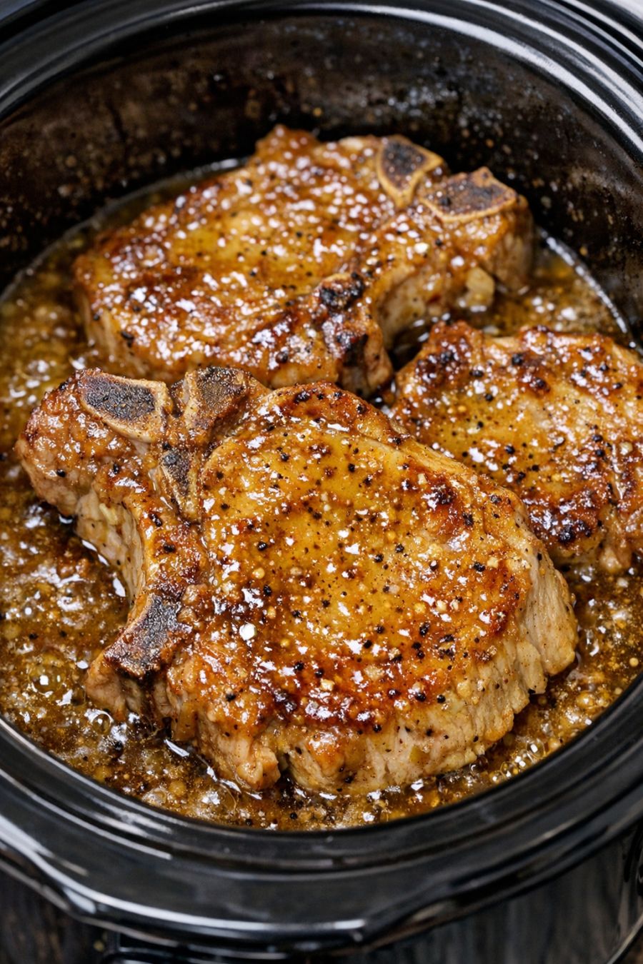 Cover and cook on LOW for 6 to 7 hours or on HIGH for 3 to 4 hours, or until the pork chops are very tender and the meat pulls away easily from the bone. The sauce will look bubbly and slightly thickened, with a sticky, shiny glaze clinging to the chops.