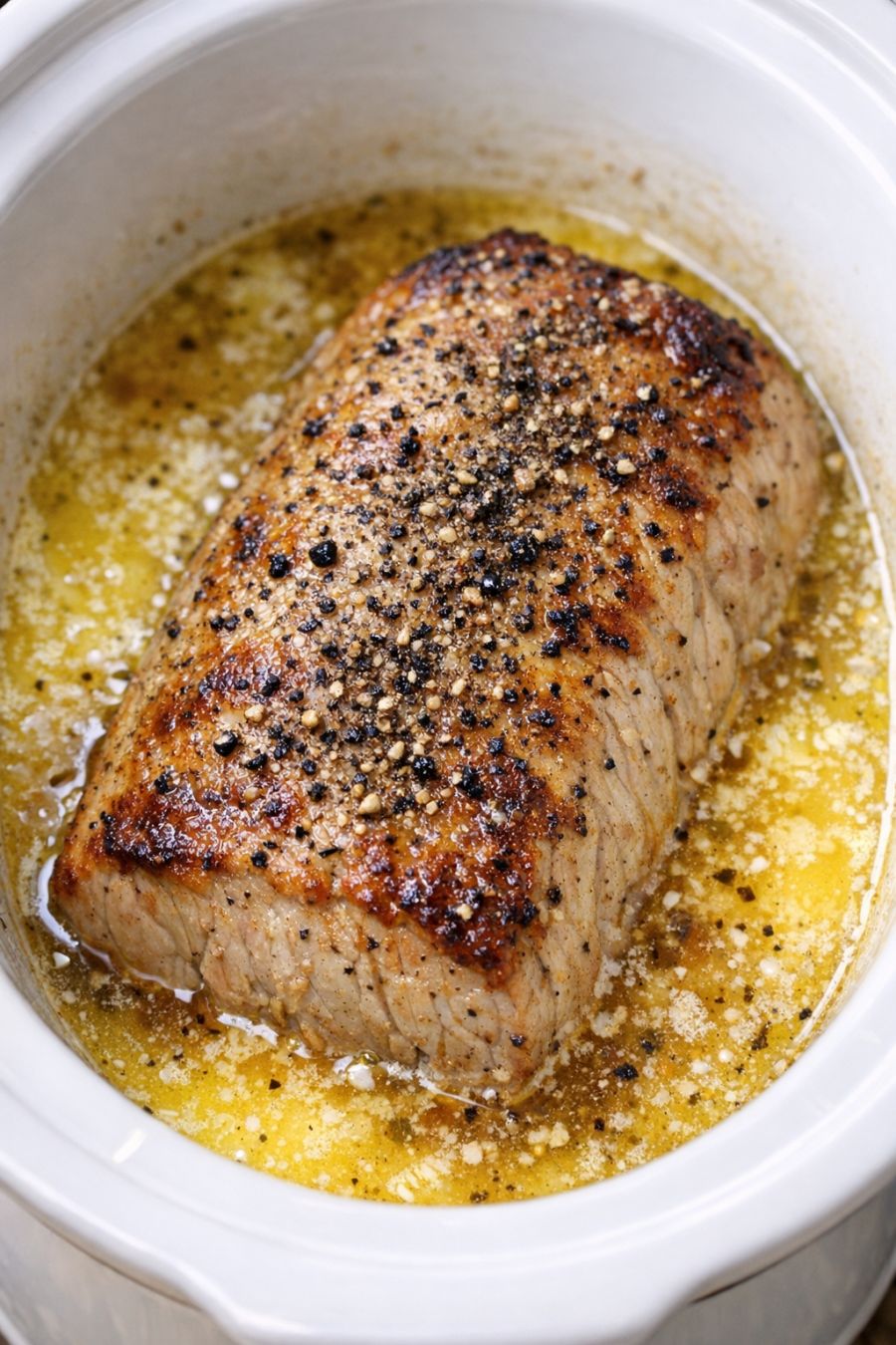 Return the browned pork loin to the slow cooker, nestling it back into the buttery juices. Spoon some of the hot butter sauce over the top and let it rest, covered, for 10 minutes to reabsorb some of the juices.
