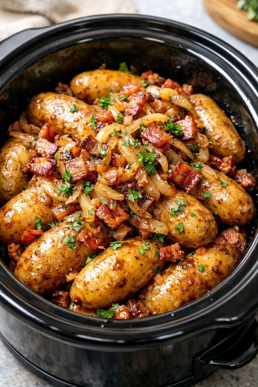 If you like a touch of color, you can use a mix of yellow and red fingerling potatoes, though the basic method stays the same. For a slightly smokier flavor, use bacon grease from thick-cut or hickory-smoked bacon. If you prefer a bit of crust on your potatoes, transfer the cooked potatoes and onions to a baking dish and slide them under the broiler for a few minutes to lightly brown the tops. You can also stir in a tablespoon or two of chopped fresh parsley or chives right before serving for a fresh, green note that brightens the richness. For a heartier one-pot meal, layer a few raw, lightly salted chicken thighs under the potatoes in the slow cooker and cook on LOW until both the chicken and potatoes are tender, keeping in mind that this will change the texture and add more juices. If you need to avoid too much salt, reduce the initial salt slightly and season more carefully at the end to taste. Leftovers reheat well in a skillet over medium heat, where the potatoes can crisp up a bit in their own bacon fat for a next-day breakfast side.